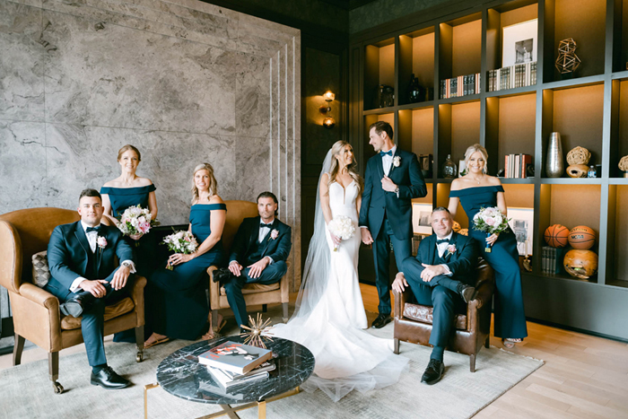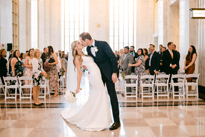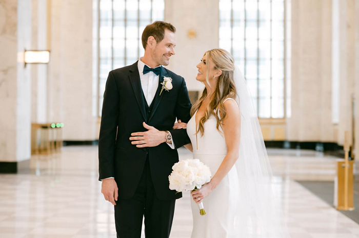 Kelsey and Justin tied the knot at Chicago’s historic Old Post Office, with white and pink peonies, roses, and reanunculus to name just a few of their wedding blooms. The stately marble setting and contemporary designs made for an upscale and sophisticated yet romantic tone. What a gorgeous couple and day! (Photos by Noell Adams Photography.
