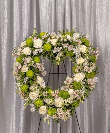 Embrace the sacred connection you share with our Divine Open Heart Standing Spray. Thoughtfully arranged with care, this white floral funeral standing spray offers gentle comfort during your time of mourning.