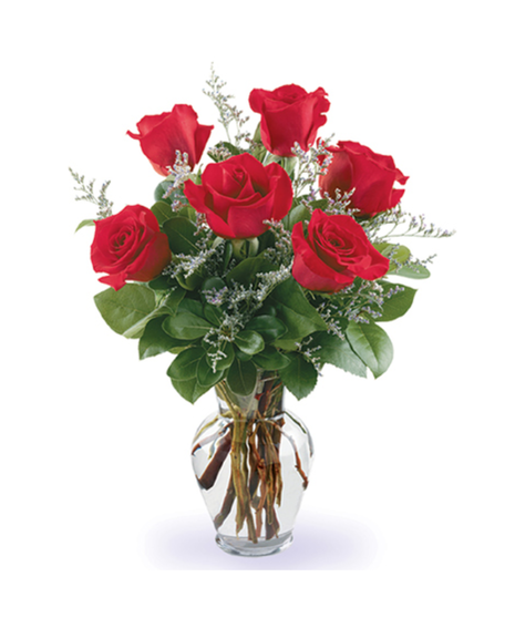 Six premium, fresh from the farm roses arranged in a glass vase with foliage and tasteful accents. When ordering, simply indicate your color preference. Prices vary according to stem length.