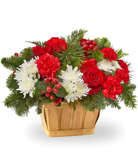 Spread glad tidings to everyone on your list with this cheery basket bouquet filled with festive red and white blooms to make the holidays bright. This joyful design includes crimson roses, fluffy red carnations, snow white poms, or similar fresh favorites, combined with fragrant pine and delivered in a natural basket. Brimming with joy! Approximately 13 to 15 inches in width. Available for delivery in Chicago and suburbs from after Thanksgiving through Christmas and early January. Style of basket may vary. (Photo copyright FTD.)