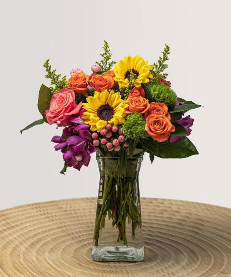 Radiate positivity with the Great Vibes flower arrangement for local flower delivery! Infuse any moment with warmth thanks to this vibrant mix of peach roses, sunflowers, and assorted blooms. Celebrate the nurturing spirit of motherhood on Mother’s Day, mark milestones on birthdays and anniversaries, wish someone get-well-soon, or send flowers for no reason at all- Just Because! Enjoy the experience of our fast local flower delivery service. With same-day and next-day local flower delivery usually available, reserve your flowers online now for a hassle-free floral experience!