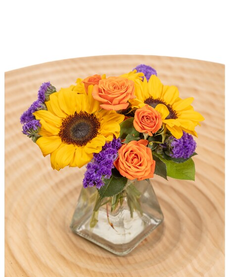 A majestic burst of color, the Royal Glow bouquet radiates warmth and elegance. Featuring a brilliant sunflowers, complemented by orange spray roses and rich purple statice, this stunning arrangement is a regal display of beauty and charm. Nestled in fresh salal greenery and arranged in a sleek 5” square gathered glass vase, it’s the perfect balance of bold and graceful. Ideal for celebrating milestones, expressing gratitude, or simply spreading joy, this bouquet makes any moment feel extraordinary.
