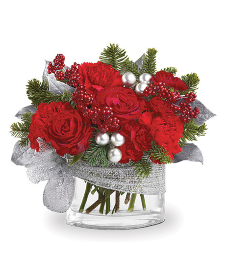 A stylish compact holiday bouquet, featuring roses, carnations, miniature carnations, berries, holiday greens, and silver ornaments, designed in a glass cylinder bowl or cube and trimmed with silver ribbon. Approximately 7 to 8 inches in width. Available for delivery in Chicago and most suburbs from after Thanksgiving through early January. (Photo copyright Teleflora.)
