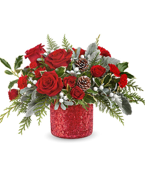 New for Christmas 2025! Send Happy Holiday wishes with this distinctive design of rich red roses, greens, accents, and more in a dazzling, keepsake holiday vase. Eye-catching and distinctive! This deluxe bouquet includes roses, spray roses, carnations, mini carnations, Dusty Miller, pine, or similar fresh seasonal selections. Approximately 11 to 12 inches in height. Available for delivery in Chicago and most suburbs after Thanksgiving till Christmas 2025, while supplies last. Style of container may vary in some locales. (Photo copyright Teleflora.)