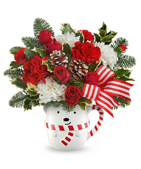 New for Christmas 2025! Make someone merry with this adorable bouquet of fresh holiday blooms nestled in a keepsake bear mug, perfect for holiday sipping. Great for coffee, tea, and hot chocolate lovers! This charming gift includes spray roses, carnations, mini carnations, cushion poms, and mixed holiday greens. Approximately 11 to 12 inches in height. Available for delivery in Chicago and most suburbs after Thanksgiving till Christmas 2025, while supplies last. Style of mug may vary in some locales if necessary. (Photo copyright Teleflora.)