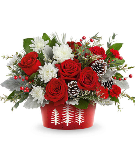 New for Christmas 2025! Share the beauty of the season with this joyful centerpiece of holiday blooms artfully arranged in a festive, food-safe serving dish. Two gifts in one! This popular design features red roses and miniature carnations, snowy white cushion poms, limonium, Dusty Miller, or similar seasonal favorites, with pine and winter accents. Approximately 16 to 17 inches in length. Available for delivery in Chicago and most suburbs from after Thanksgiving till Christmas 2025, while supplies last. Style of container may vary in some locales. (Photo copyright Teleflora.)
