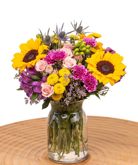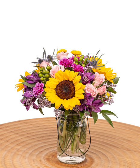 A rainbow of colors in one Mason jar. That's what you'll get with The Mallory flower arrangement! It's perfect for any occasion, from birthdays and anniversaries to promotions and holidays. A lovely mix of carnations, alstroemeria, and sunflowers, it's sure to brighten anyone's day. So brighten up your loved ones' day with this beautiful bouquet today!